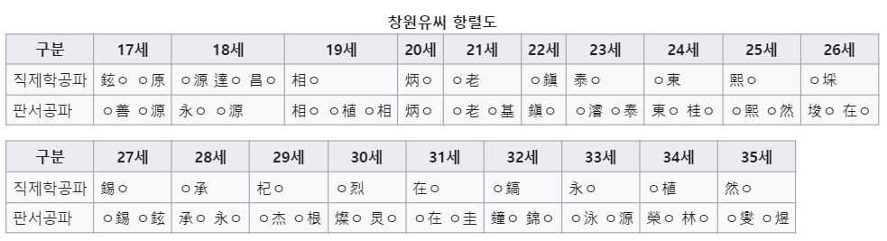 창원유씨의 개간보(1726년)에는 직제학공파는 15세까지, 판서공파는 16세 일부까지 기재되어 있습니다. 그러나 실제로 항렬자(行列字) 예정도를 만들어서 작명에 활용하기 시작한 것은 제2차 수원파세보(1781) 이후입니다. 이에 따라 족보상에 항렬자가 오행법에 의해 규칙적으로 쓰여진 것은 직제공파는 17세부터이고, 판서공파는 18세부터입니다.